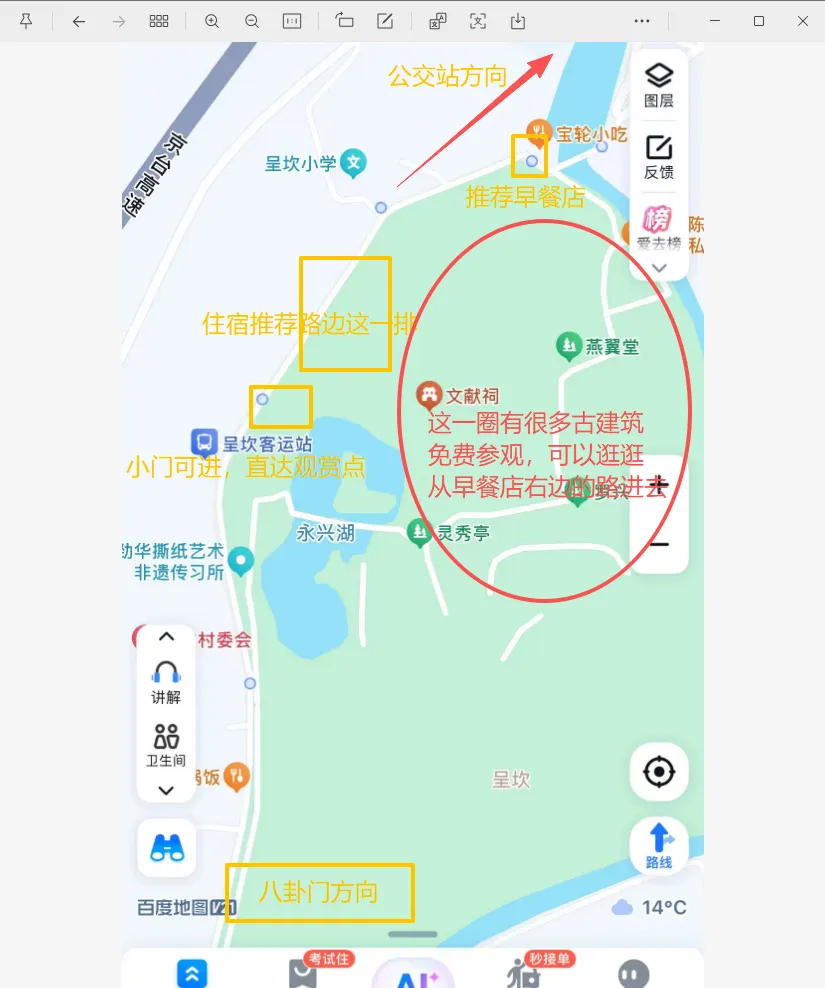 抵达黄山北站后,可直接打车到呈坎景区,车程大约30分钟,费用约47.2元。也可以公交前往,出高铁站后找到公交站,游9或17路公交可到。注意,是公交站,不是客运站,不要走错了。