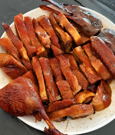 第五美食:阮桥板鸭——冬日限定的“腊味传奇”这是用大雁和野鸭杂交的“齐毛鸭”做的,经过十二道工序,日晒夜露风干而成。肉质紧实,腊香浓郁,最经典的吃法是板鸭炖老黄豆,黄豆吸饱了鸭油和汤汁,比肉还好吃!这是过年必备的年货,现在也能买到真空包装的带走。