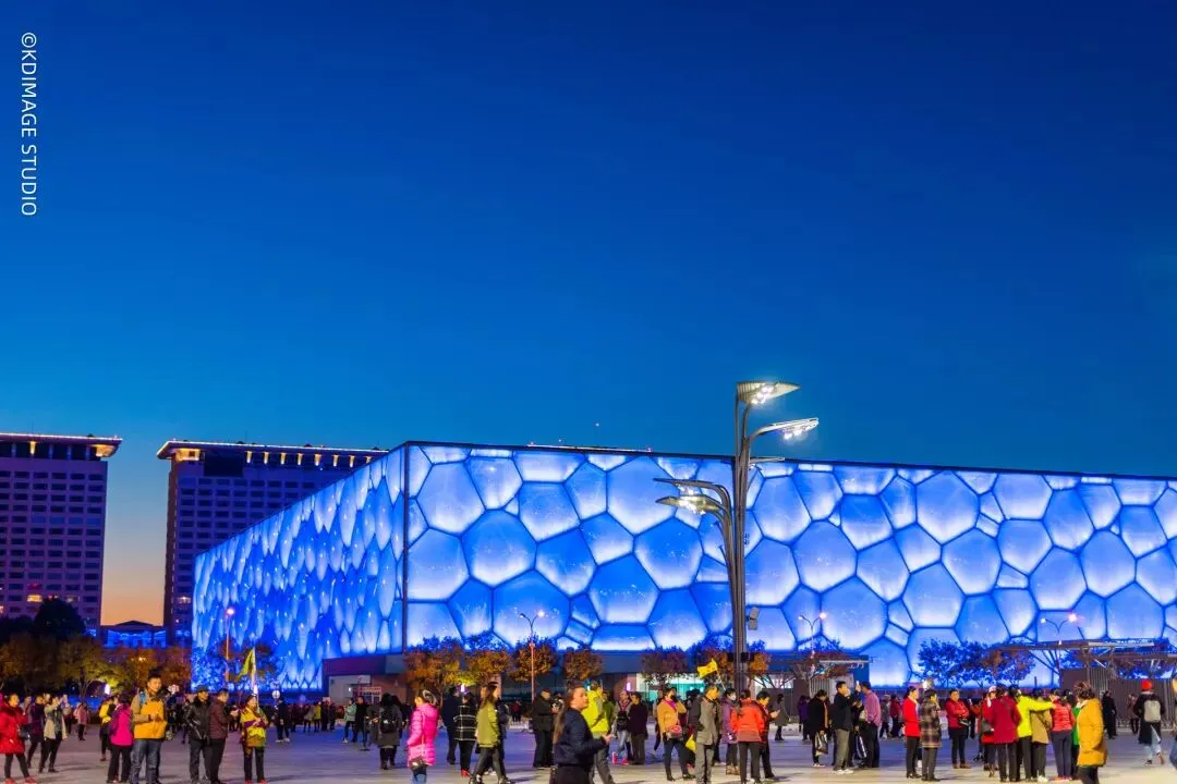 相比起白天都水立方,夜晚的时候更加光彩夺目,夜幕降临时,水立方便亮起灯光,远远望去像是一汪气泡的蓝色海水。当然比较特别的是,水立方在细节方面也做得非常细致,颜色会交替渐变。