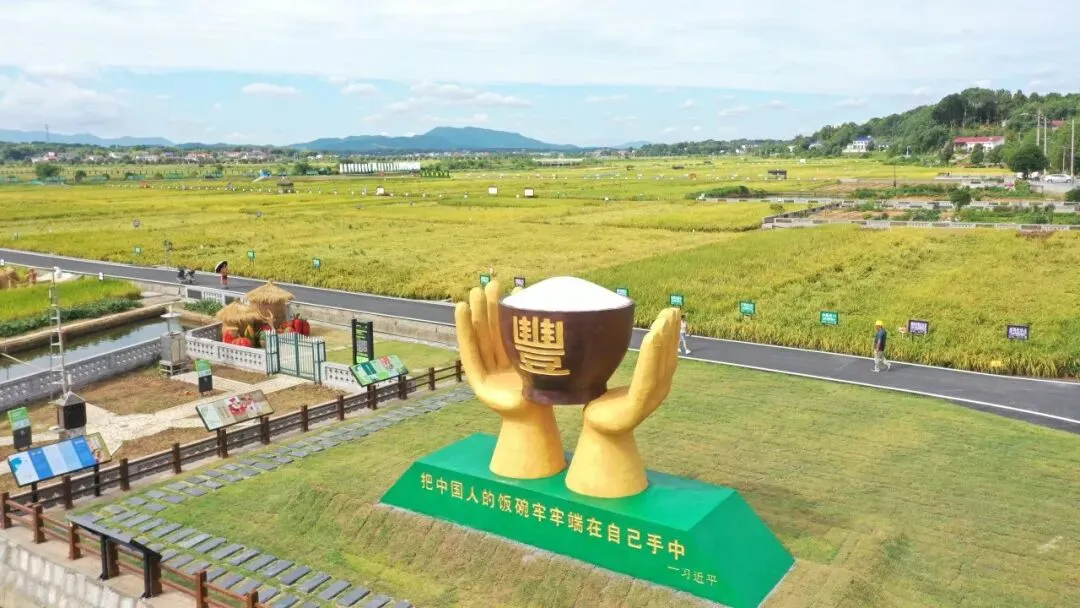 踏入隆平稻作公园,最先映入眼帘的是那只托举着“豊”字巨碗的金色大手雕塑,底座上“把中国人的饭碗牢牢端在自己手中”的字样醒目而有力。