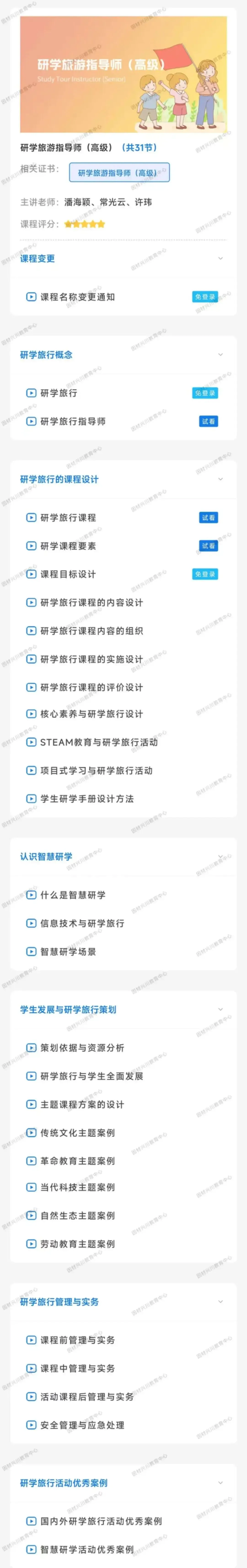 《研学旅游指导师》课程是面向研学旅行、综合实践、劳动教育等实践教育领域,以研学兼职中小学教师、导游、中高职在校生和毕业生等有志从事研学旅行事业的人才为培养对象,针对中小学研学实践教育教学的内容目标和人才培养需求的在线职业技能培训项目。