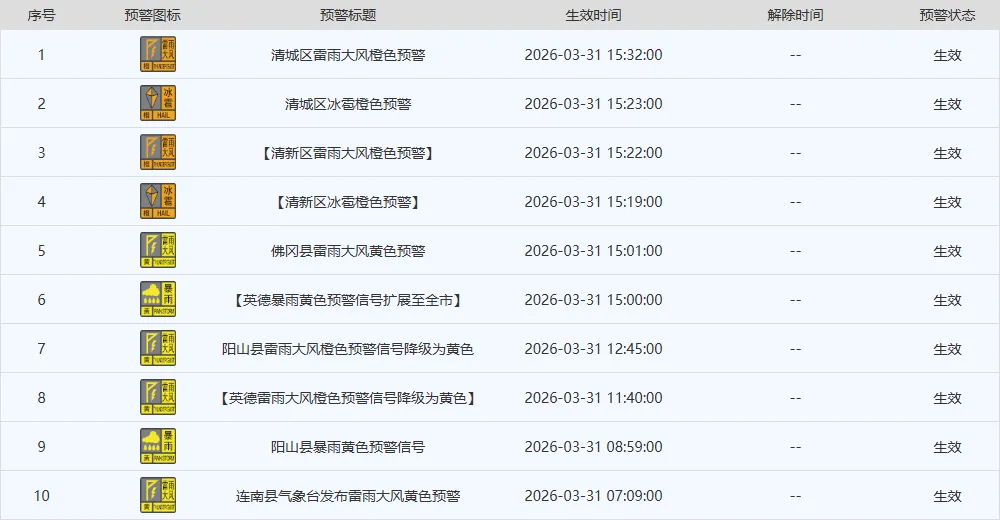请通过“清远天气”微信公众号/官方微博实时关注预警信号,当前暴雨、雷雨大风、冰雹等预警正在生效中,请务必取消一切户外行程,切勿进入山区、峡谷、溪流等危险区域。