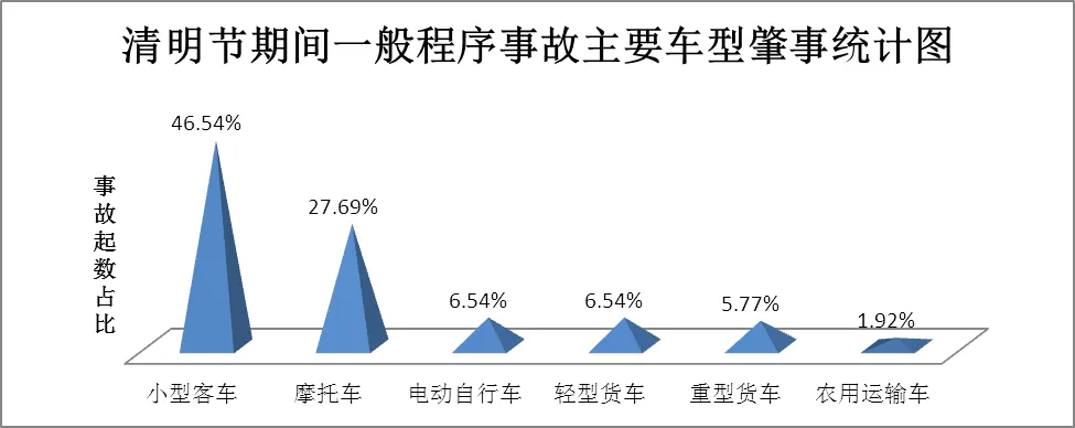 2.从肇事车辆类型看,小型客车、摩托车肇事突出。小型客车、摩托车肇事居前两位。其中,小型客车肇事占事故总量的46.54%,高于平时(44.88%)1.66个百分点,较大事故均为小型客车肇事。摩托车肇事占总量的27.69%,高于平时(26.27%)1.42个百分点,电动自行车和轻型货车肇事各占总量的6.54%(如图4所示)。