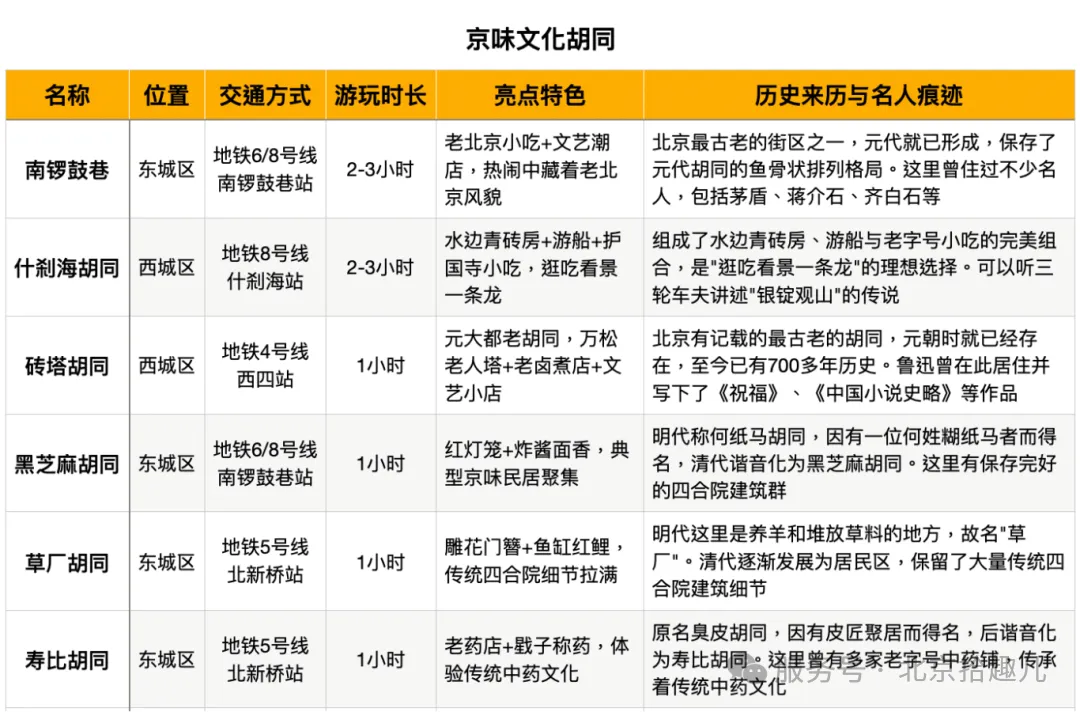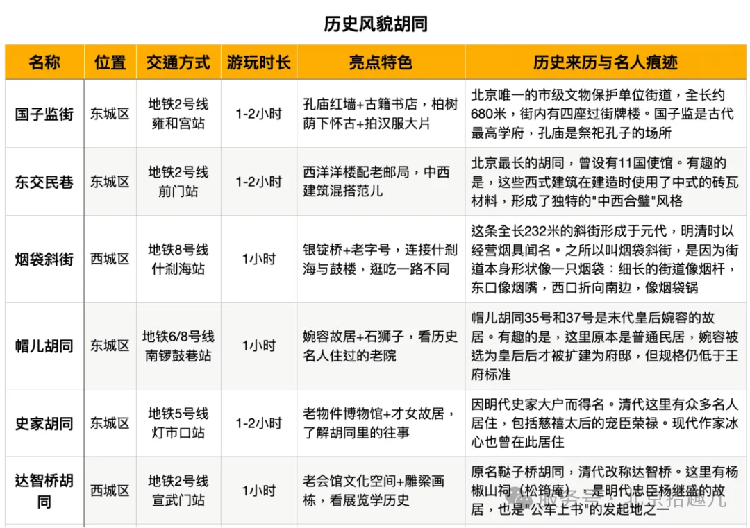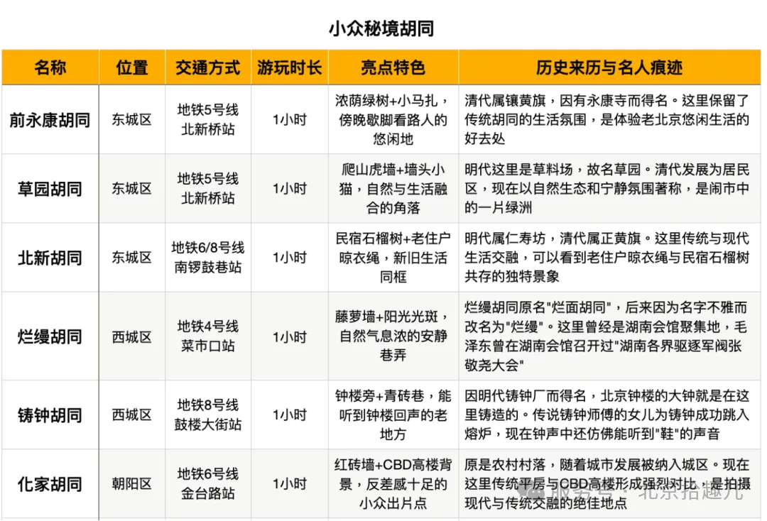 路线:南锣鼓巷 → 帽儿胡同 → 雨儿胡同 → 北锣鼓巷亮点:主街热闹氛围、名人故居、真实四合院生活、安静咖啡馆时长:5-7小时特色:体验商业化与真实生活的对比,发现老北京生活景象