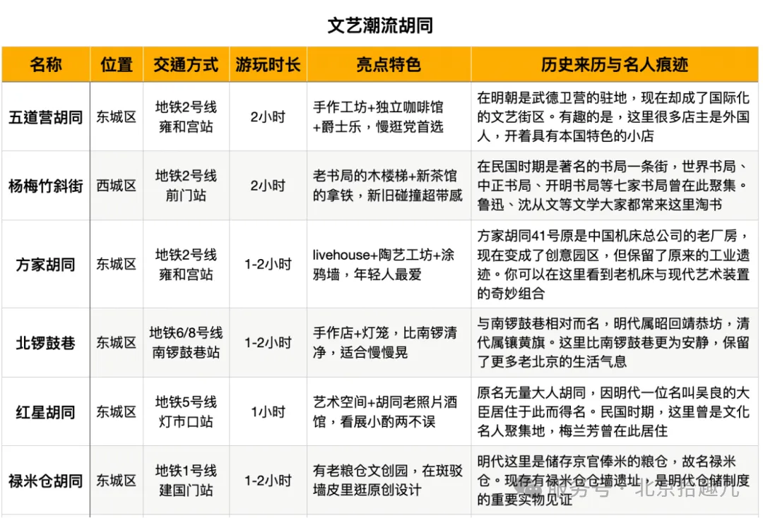 路线:雍和宫 → 国子监街 → 五道营胡同 → 方家胡同亮点:藏传佛教寺院、唯一牌楼街、创意小店、老厂房艺术区时长:6-8小时特色:古老文化与现代创意融合,适合文艺青年和摄影爱好者