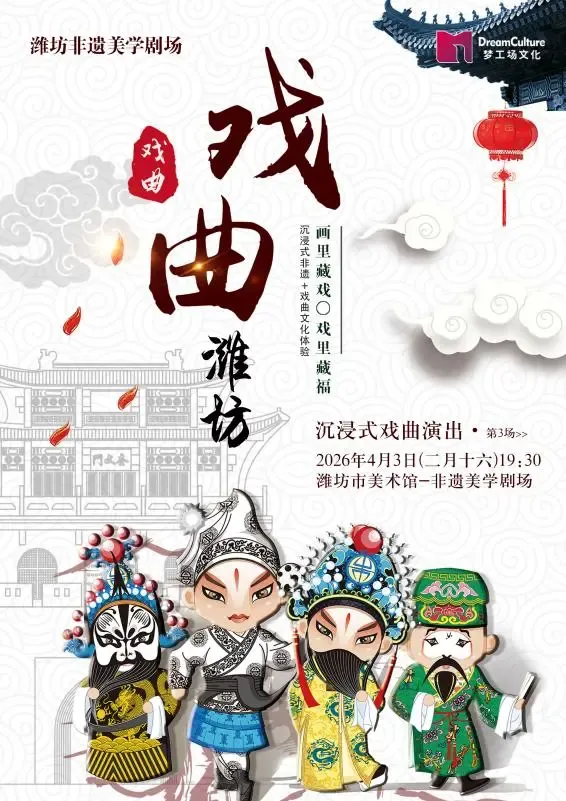 “戏曲潍坊”沉浸式戏曲演出将在潍坊非遗美学剧场开幕,演出将延续美术展览与非遗戏曲的梦幻联动,动静之间,既可参观美术展览,沉浸式欣赏艺术作品的独特魅力,又能聆听婉转悠扬的经典戏腔,看名家名伶精彩演绎。