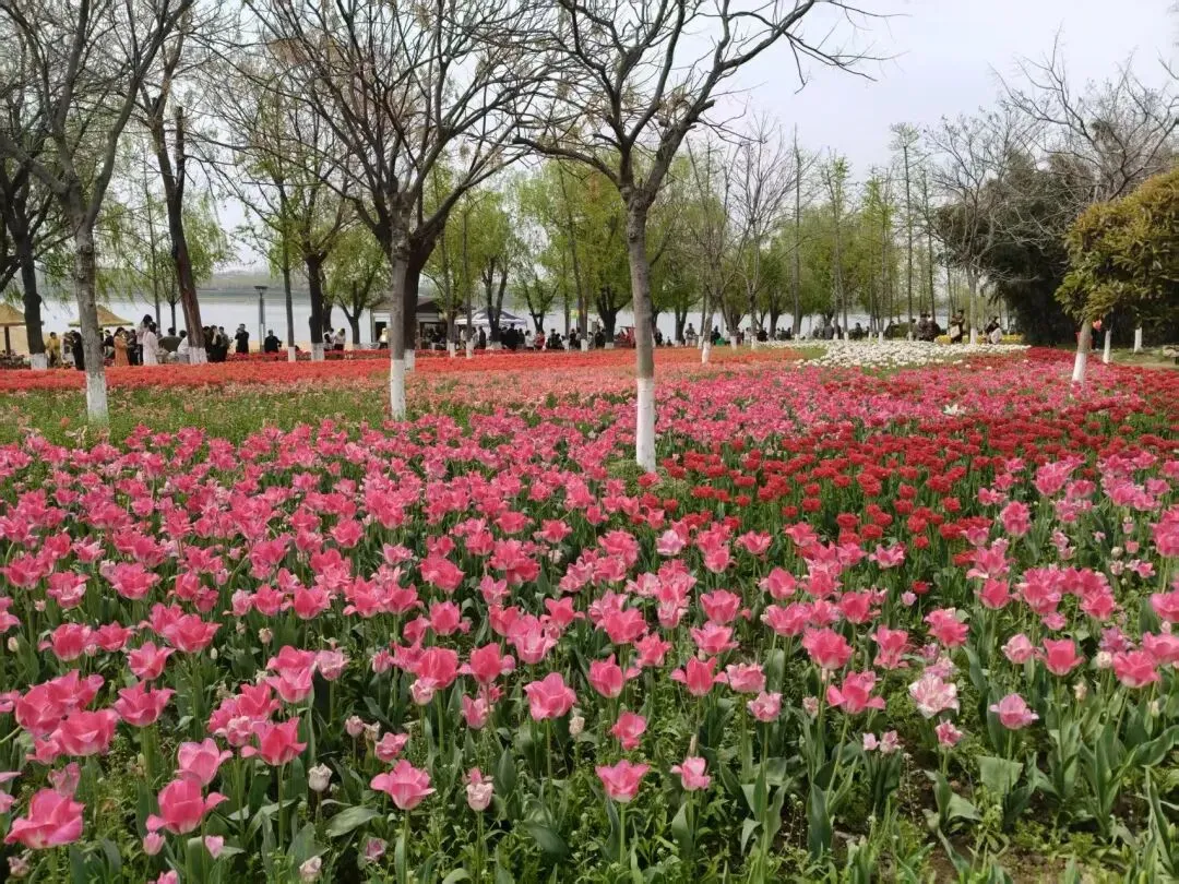 白河滩湿地公园里郁金香花海美轮美奂,如梦似幻。