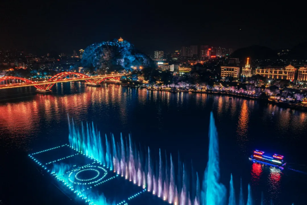 到晚上的时候,柳江夜游一定要安排上!晚上八点,可以看“世界第一水上音乐喷泉" ,几十米高的水柱随着音乐变换各种造型,配合着两岸璀璨的灯光,特别震撼。