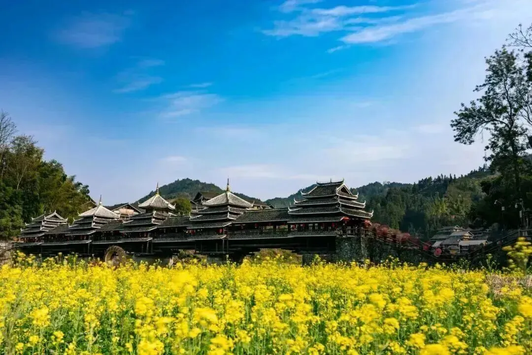 桥旁边就是程阳八寨,由八个侗族村寨组成。你可以在这里住一晚吊脚楼,吃一顿地道的侗族百家宴,听一听被誉为 "天籁之音" 的侗族大歌,看一看原汁原味的侗戏,感受侗族人民的热情好客。