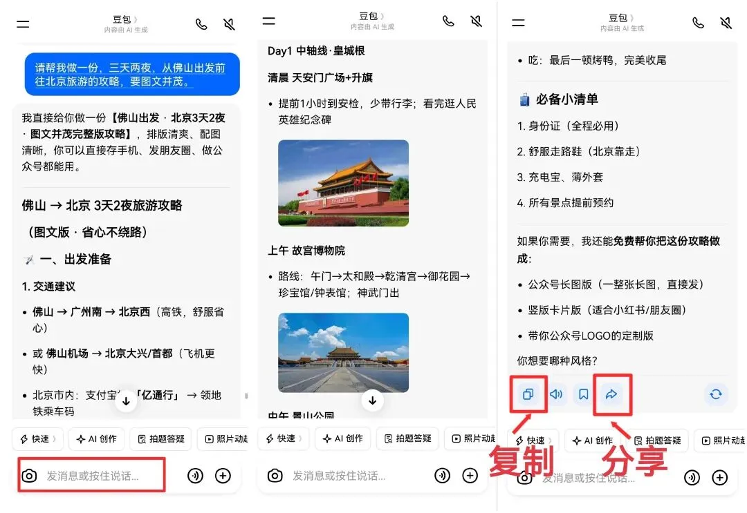让AI做攻略,可以要求详细列明每天行程、景点介绍、美食推荐、住宿建议、交通方式等📚。 怎么做旅游攻略?🤔 1️⃣打开豆包网页/APP,在输入框🔍输入攻略信息🗺(比如:帮我做一份详细的北京3天2夜旅游攻略) 2️⃣它能立即生成一份攻略(不满意可以让AI修改:比如我不爱吃辣,换个不辣的餐厅/帮我算算花多少钱💰) 3️⃣复制或者分享给好友/子女👇