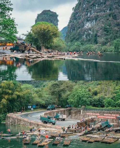 漓江这事儿得说清楚,很多人被坑就坑在没搞懂漓江到底有几段,漓江精华段是从桂林磨盘山码头到阳朔的这一段,20元人民币背景图那个九马画山就在这段,这段水路只能坐大船游,不是竹筏,大船是那种能坐一两百人的游船,四个多小时从桂林漂到阳朔,沿途看两岸的山水,这是最经典的漓江游览方式。但问题来了,很多人觉得大船太商业化,想坐竹筏体验那种小船在水上漂的感觉,那就得去杨堤到兴坪这一段,这段可以坐竹筏,风景也不错,但跟20元人民币那个角度不在一个位置,你得在兴坪下了竹筏之后再走到观景台才能看到。