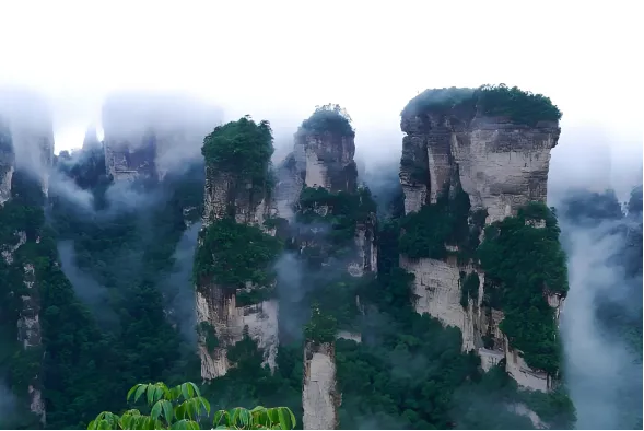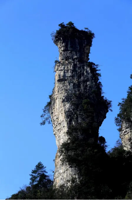 九道门是喀斯特峰丛地貌,由跪狮台边悬崖顶端的13根最大石柱组成,石柱错落有致、异峰突兀、古松苍劲、林木葱郁、拔地而起、险峻非常。这里重峦叠嶂、峰丛林立、怪石耸峙,是奇峰异石荟萃之地。各类山峰在这里争奇斗险,竞展秀美与雄姿,向人类展现着万年以来经流水侵蚀、溶解、切割形成的时间之美,数座挺拔秀丽的独立山峰,像支支巨笔正在蓝天上描画,让人心中升起对大自然造化的敬畏之情。