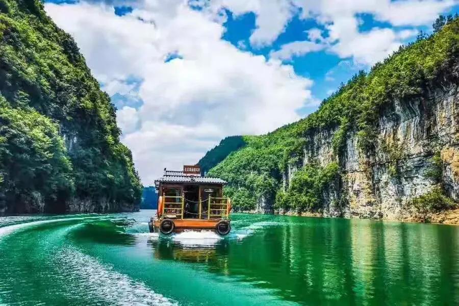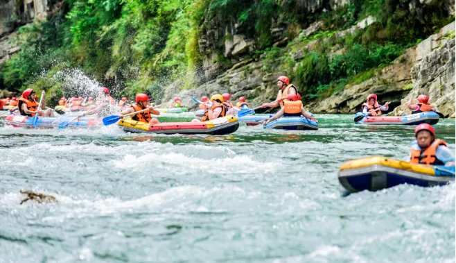 漂流两岸原生态峡谷风光如画,河流顺势而下,跌宕起伏,浪遏飞舟, 被业内人士誉为“中国风景最美的漂流”。峡谷忽而悬崖峭壁如刀削斧劈,忽而奇峰怪石侧面耸立,飞瀑穿行其间,水帘洞若隐若现。