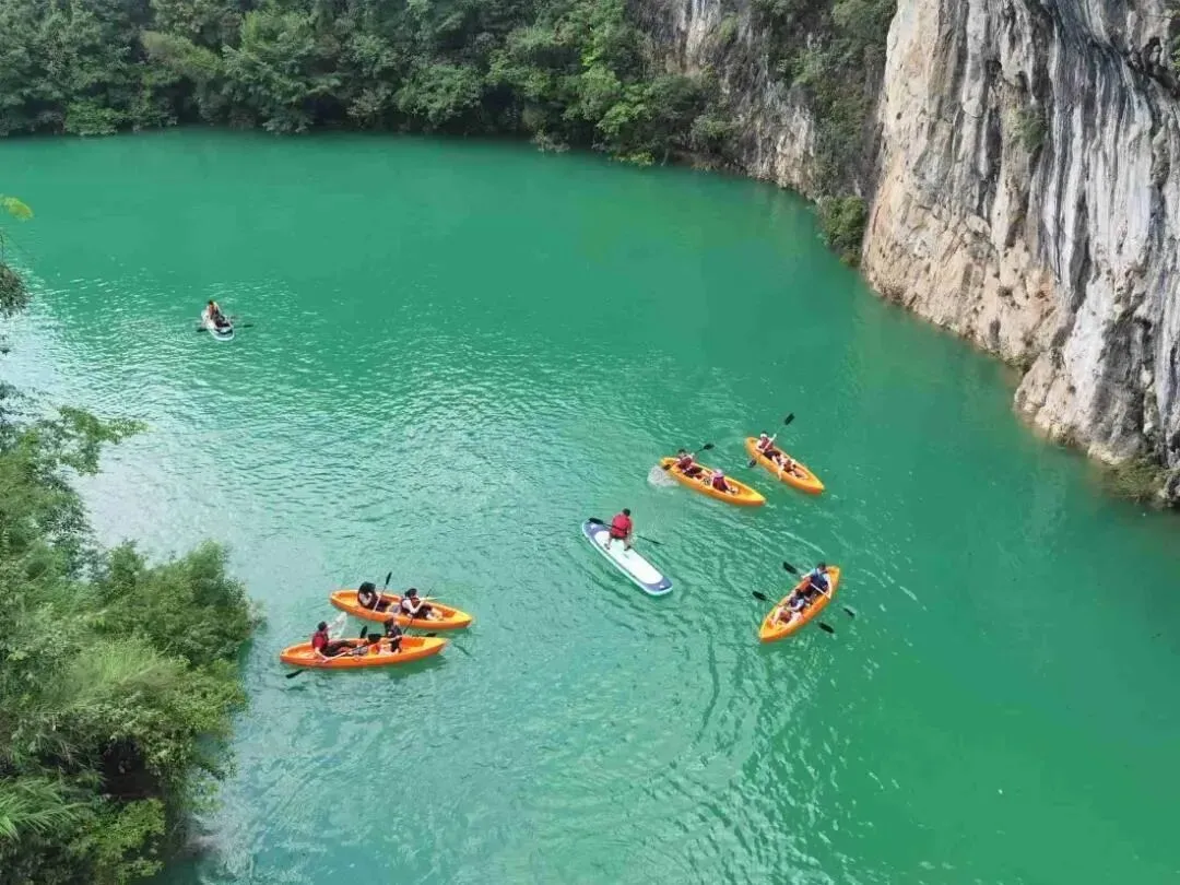 清溪峡坐拥翡翠般碧绿湖水与喀斯特峡谷风光,桨板、皮划艇亲水体验老少皆宜。专业教练全程护航,新手也能快速上手,泛舟湖面穿梭于青山碧水间,既可悠闲赏景拍照,也能结伴竞速嬉水,沉浸式感受天然氧吧的清凉与惬意,是避暑度假、亲子出游、户外休闲的绝佳选择。