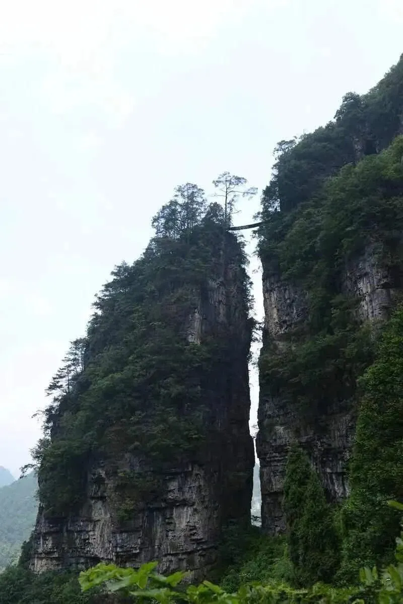 五峰岭系清光绪二年(1876年)建造的高空悬索桥、古代寺庙遗址及隐世安宁如世外桃源般的山谷民宿村寨。由从西向东的五座山峰排列而成。五峰高插入云,形似一只巨大的凤凰。最西面山叫凤头峰,如凤凰的头部,从基座到峰顶高百余米,险不可攀。山顶一棵珍稀的红豆杉,恰似凤凰翡翠的羽冠。凤头后面是峰坡稍缓的凤颈峰,绿树如羽,当花树盛开,或树叶霜红时,凤颈便斑斓美丽。凤颈峰左右的两座凤翼峰,如凤凰展开的双翼,呈现出翩翩欲飞的姿态。最后是凤尾峰。紧接在左右凤翼峰的相接之处,中间有一道2-5米宽80多米的裂痕一线天,美丽神奇。从山底到峰顶石梯共计888阶。