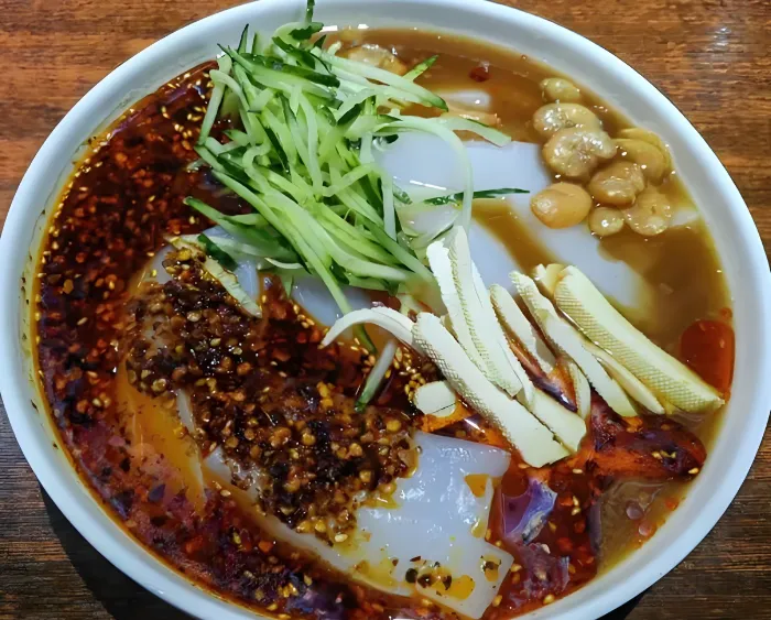 第二美食:浑源凉粉夏日限定的救命神器!土豆淀粉做的凉粉,切成细条,浇上黄瓜丝、豆腐干、陈醋、辣椒油和蒜汁,最后撒上炸蚕豆。一口下去,凉丝丝、酸溜溜,暑气全消。一定要去“小媳妇凉粉”或者街头小摊,5块钱一碗,这才是地道的北岳一绝。