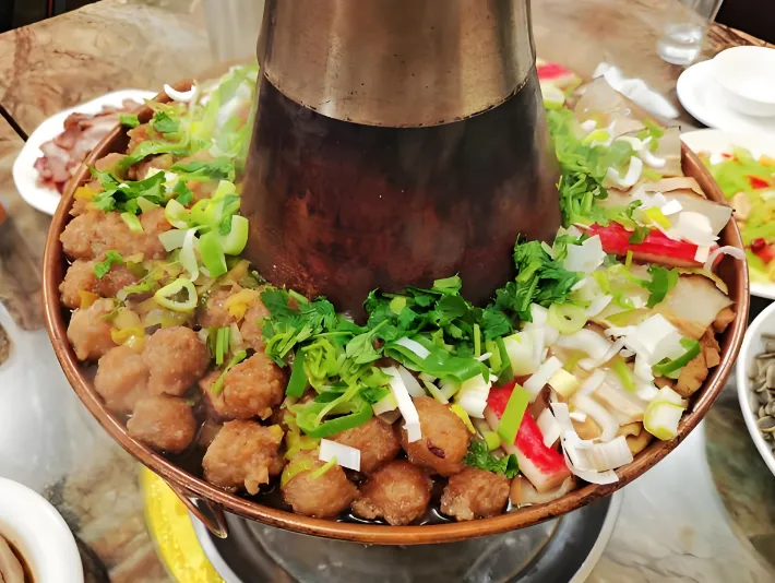 第三美食:什锦铜火锅这是大同人逢年过节的仪式感。黄铜锅里炭火慢炖,底层铺上白菜、粉条、海带,上面整齐码上排骨、丸子、烧肉、豆腐。荤素搭配,层层叠叠,浇上醇厚的高汤,越煮越香。冬天吃暖身,平时吃解馋,人均60元就能吃得很好。