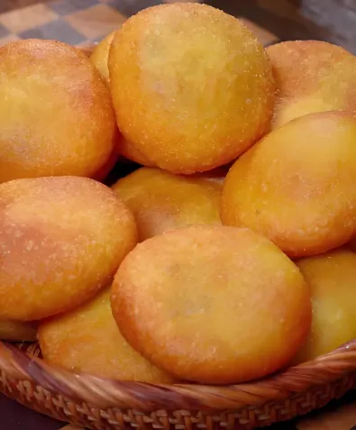第四美食:黄米油炸糕也叫油糕,婚宴节庆必备。黄米面做皮,包上豆沙、红糖、枣泥,下锅炸至两面金黄起泡。外酥里软,香甜可口。在古城里的早餐摊或者“紫泥369”都能吃到,3-5块钱一个,老人孩子都爱吃。