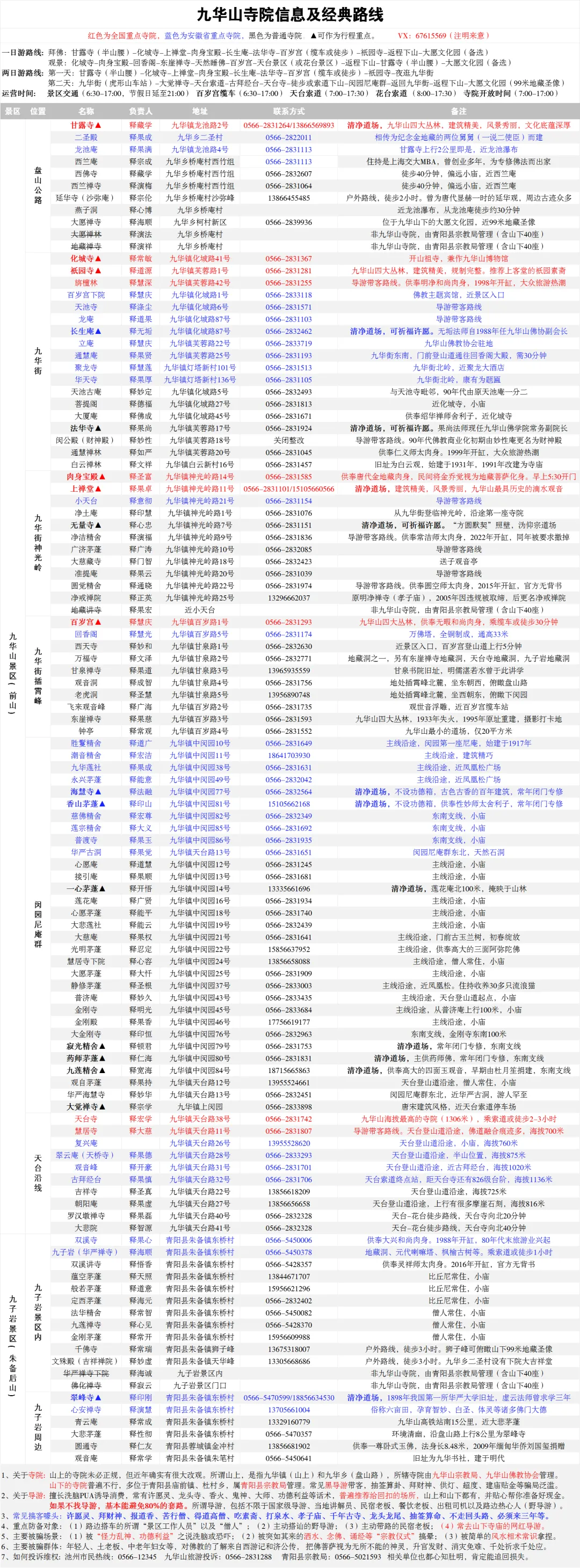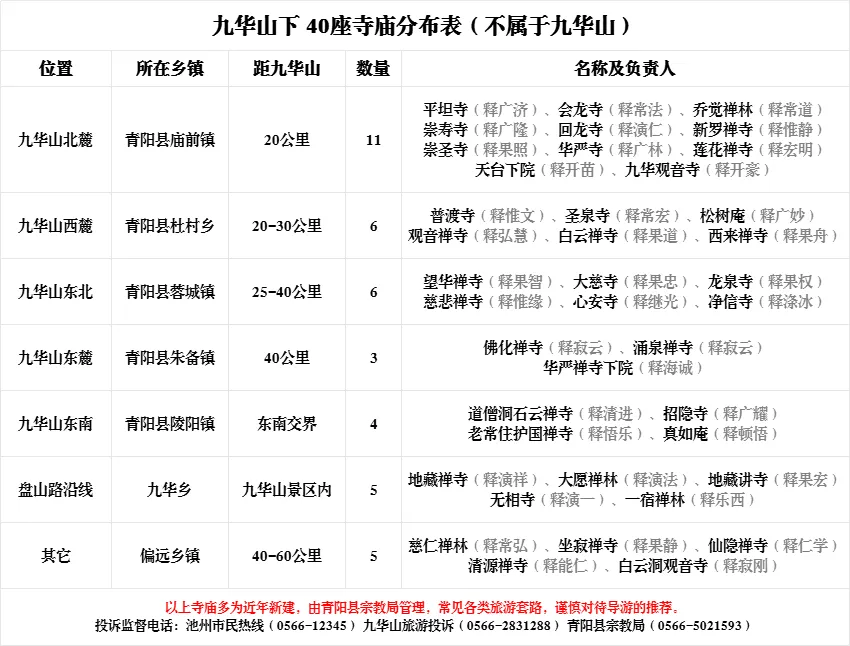 闵园景区是位于插霄峰和天台峰之间的一条峡谷,南北走向依次是上闵园,中闵园和下闵园,一条龙溪纵贯而过。◆上闵园:天台索道站位于上闵园,邻近有大觉禅寺。从九华街(虎形山车站)乘坐景区巴士,在天台索道站下车即是,车程约15分钟。◆中闵园:闵园尼庵群所在地,分布有30座尼庵。从九华街(虎形山车站)可以乘坐景区巴士,在终点站(凤凰松车站)下车即是。天台景区为高山游览区,天台寺坐落于天台峰顶,海拔1306米,是九华山海拔最高的寺院。九华山最高峰十王峰位于天台峰南侧,海拔1342米。◆索道:索道站(上闵园)-拜经台-天台寺-十王峰-索道下山,乘坐索道15分钟到拜经台,然后爬826级台阶到天台寺;十王峰位于天台寺正南,徒步前往约20分钟。如乘索道往返,全部游览时间约2-3小时。◆徒步:凤凰松-慧居寺-吉祥寺-复兴庵-朝阳庵-天桥寺-观音峰-拜经台-天台寺,天台登山道起点位于闵园凤凰松,徒步往返约5-6小时。当前九华山景区共有105座寺院,由九华山宗教局管理。其中包括9座全国重点寺院(1983年公布),30座安徽省重点寺院(1984年公布),62座普通寺院,以及4座固定处所。这些寺院分布于前山和后山,前山是指九华山核心景区,包括九华镇(山上)和九华乡(盘山路沿途),共有88座;后山是指九华山东麓,即青阳县朱备镇九子岩景区周边,涉及20余座,虽地处青阳县境内,但其中17座也归九华山宗教局管理,此举为统筹前山和后山协同发展。此外,九华山周边山下还有另外40余座青阳县寺庙,其中23座位于九华山北麓的庙前镇、杜村乡、蓉城镇,5座位于九华山盘山公路沿途,非常容易混淆。这些寺庙均为近年新建的普通寺庙,由青阳县宗教局管理。虽然很多名字中都带有九华山,或者跟九华山寺院同名,但实际和九华山佛教界没有任何关系。自2018年佛教商业化治理以来,九华山明显加强了管理,近年多数山上的寺庙都相对规范。由此九华山下的青阳县寺庙成为导游带客的主要场所,常见噱头包括拜财神、许愿灵、化太岁、苦行僧、见大师、龙头龙尾、千年古寺、抽签算命等,他们利用年轻人对佛教的不了解和敬畏心,与寺庙联手做局,打着九华山的名义,以怪力乱神、功德利益之说,诱导客人供灯、写牌位、请佛像、做佛事、捐功德、建庙贴金等,普遍只收现金或使用个人账户收款,并且不提供正规盖章收据,事后双方再按约定比例分成。这些行为都严重违反《宗教事务条例》,不仅损害了青阳县佛教界的声誉,也影响了九华山的旅游形象。如不慎遭遇相关骗局,可以拨打池州市民热线0566-12345或者直接报警,相关单位也心知肚明,肯定能追回损失。1、高铁(九华山站)