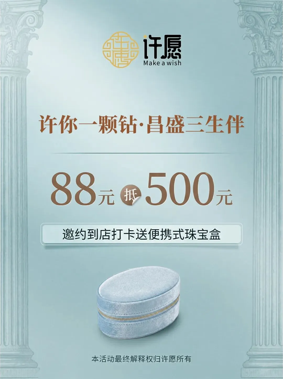 到店礼遇:活动期间,邀约到店打卡即赠便携式珠宝盒,更享88元抵500元超值优惠!