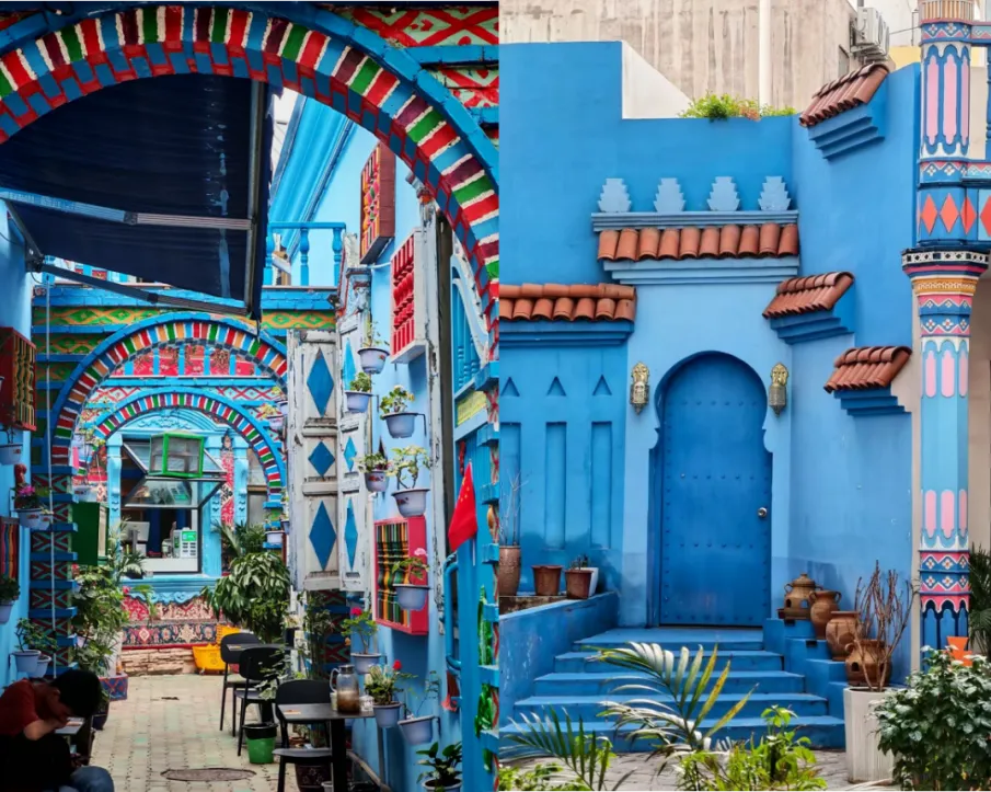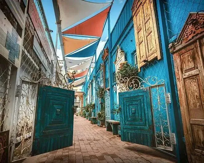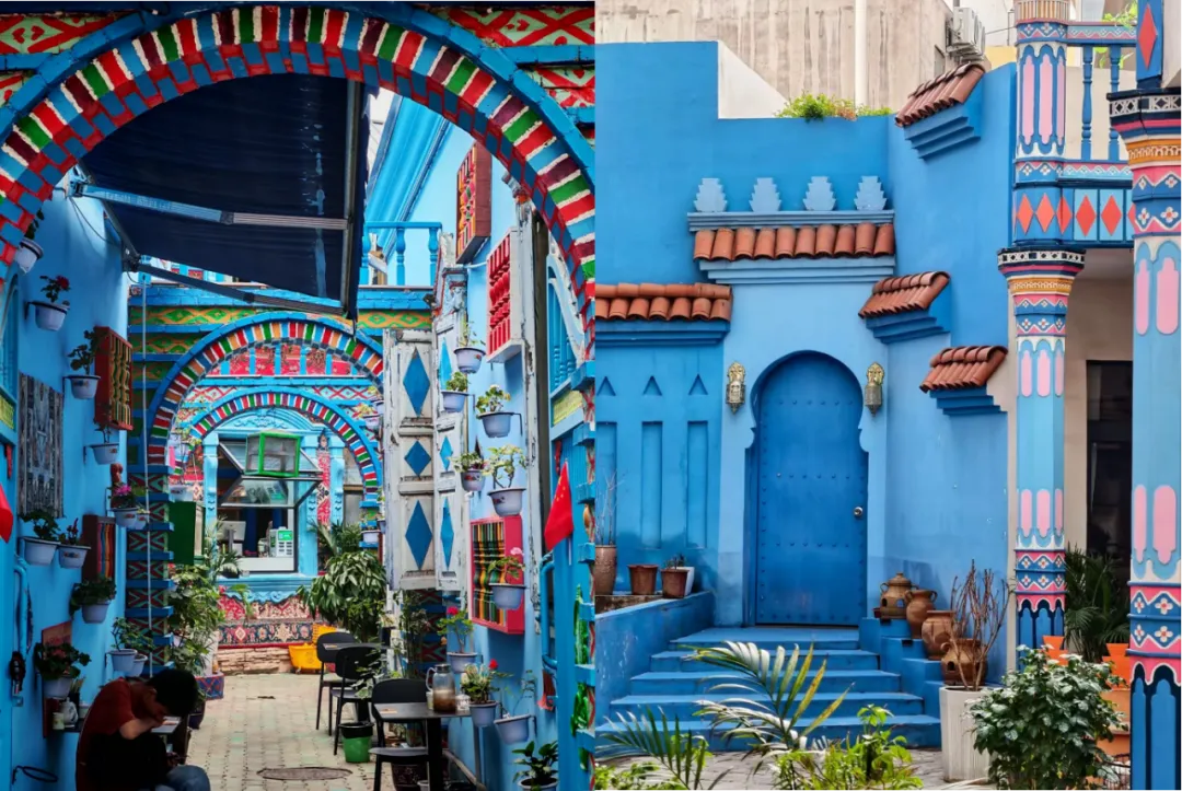 街区建筑融合了欧式、俄式、中亚及伊斯兰风格,红瓦蓝墙、彩窗雕花,既有欧式尖顶小阁楼,也有维吾尔族雕花拱门、塔塔尔族彩绘窗棂,还有俄罗斯铁皮尖顶木屋门廊,色彩明丽,宛如童话世界。