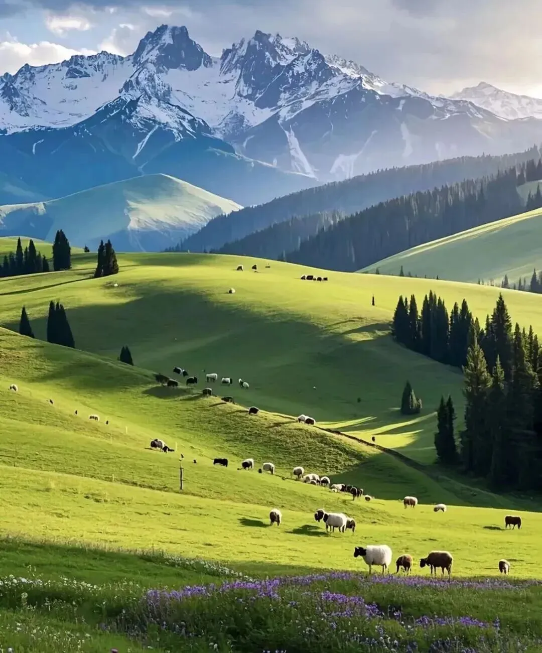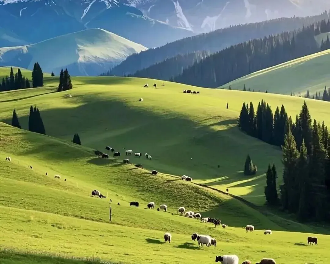 伊犁的夏天,是紫色的薰衣草海,是绿色的草原毯,是雪山的银冠。