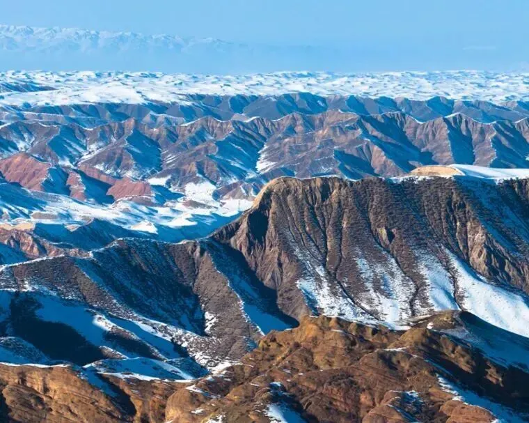 北眺天山雪峰,银冠灿然,山峦迤逦伸向远方;