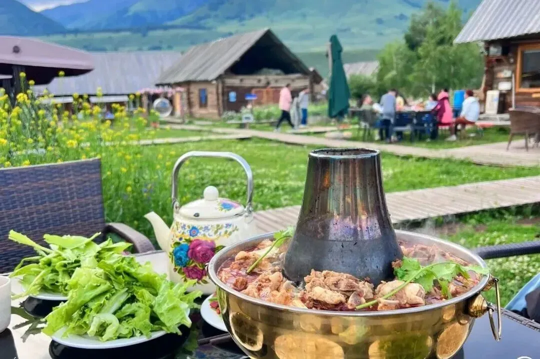 雪山脚下的禾木村,用羊骨熬制的奶白汤底,涮煮野生菌、本地牛羊肉,肉炖得软烂入味,搭配特制红油调味料,温暖治愈。
