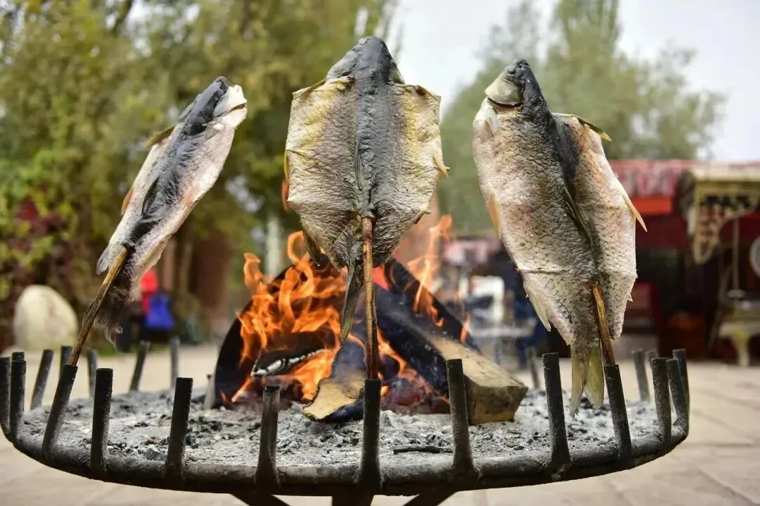 额尔齐斯河的冷水鱼狗鱼,炭火烤制后外皮焦脆,肉质蒜瓣状,撒满孜然、辣椒,搭配格瓦斯,焦香与碳酸气泡在口中炸开。
