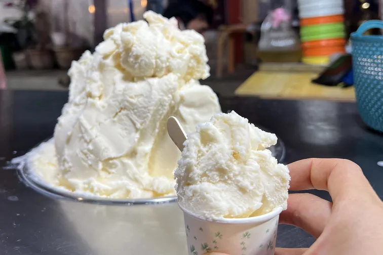 少数民族手工冰淇淋,奶香浓郁,搭配果酱和坚果碎,口感丰富,是塔城老街的特色甜品。