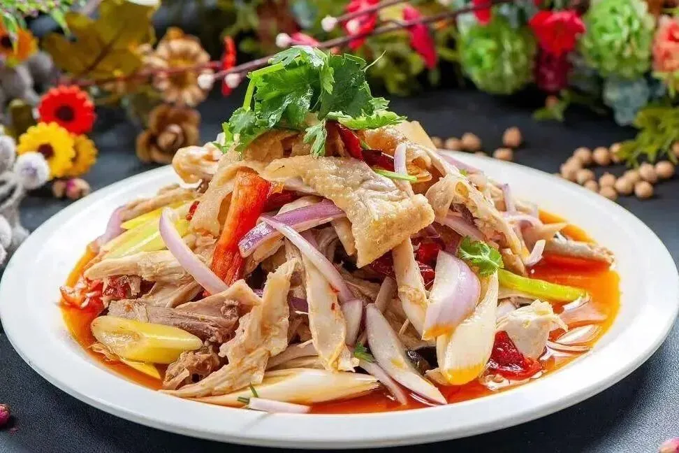 土鸡煮熟撕条,用花椒、辣椒、洋葱、香菜等调汁拌匀,麻香突出、微辣清爽,是夏季解腻的凉菜。