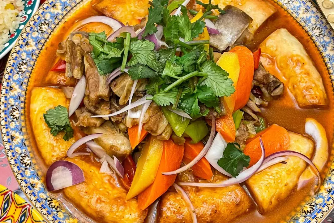 起源于沙湾,以土鸡、土豆、辣椒、皮带面为标配,鸡肉嫩滑,土豆软糯,汤汁浓郁,拌面吸饱汤汁,是北疆聚餐的必点菜品。