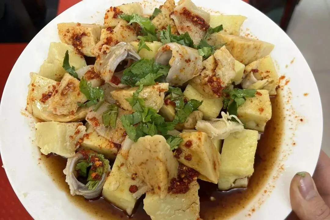 伊犁特色,将羊肺、羊肠与面筋、米肠子等混合煮熟,搭配辣椒粉、蒜泥、葱花,酸辣香润,是独特的风味小吃。