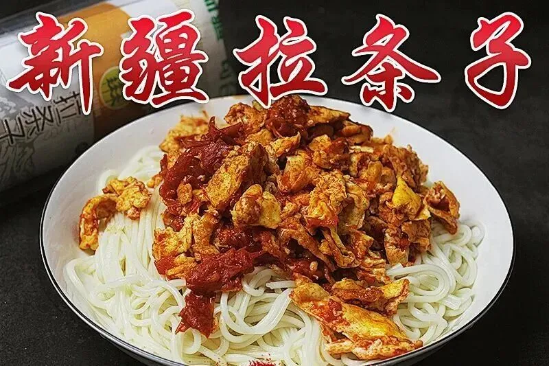 拉条子因制作时通过手工拉抻面团成条状而得名,维吾尔语称“兰格曼”,在饭馆也常被称为“拌面”。是新疆各族人民日常主食之一,也是北疆地区饮食文化的重要符号,常出现在家庭餐桌、餐馆及节庆活动中。
