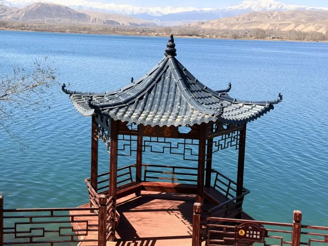 临湖筑亭,飞檐翘角。凭栏远望,黄羊河水库碧波浩渺;坐亭静赏,尽揽山河壮阔风光,山水清景与观景平台浑然相融。
