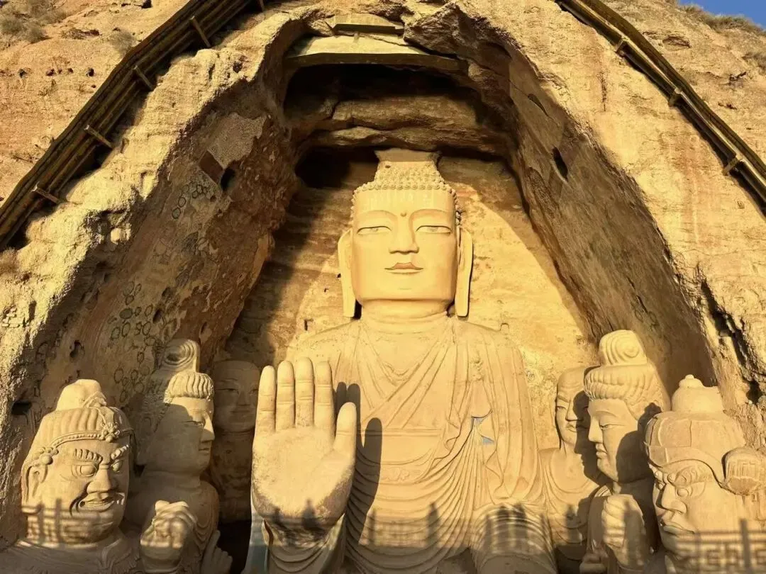 这尊依山开凿的释迦牟尼坐佛,亦是天梯山石窟的经典造像,大佛面容圆润,双目微阖,神情慈悲;右手施无畏印,左手轻覆膝上,衣纹流畅自然。千年一瞬,静候来人。