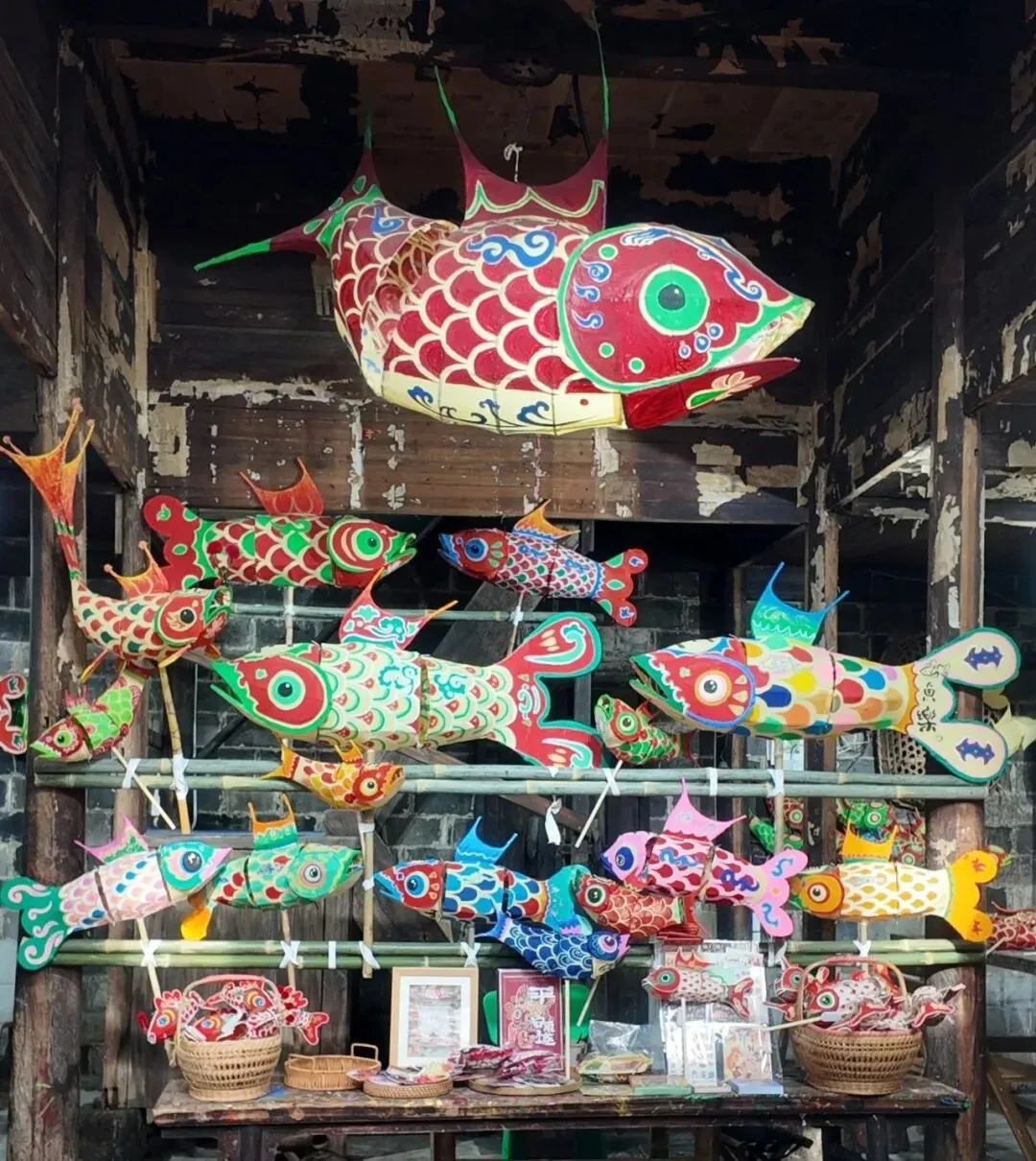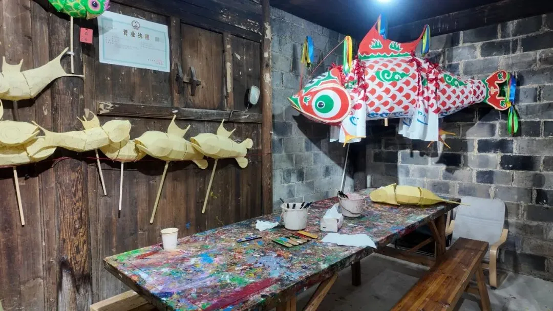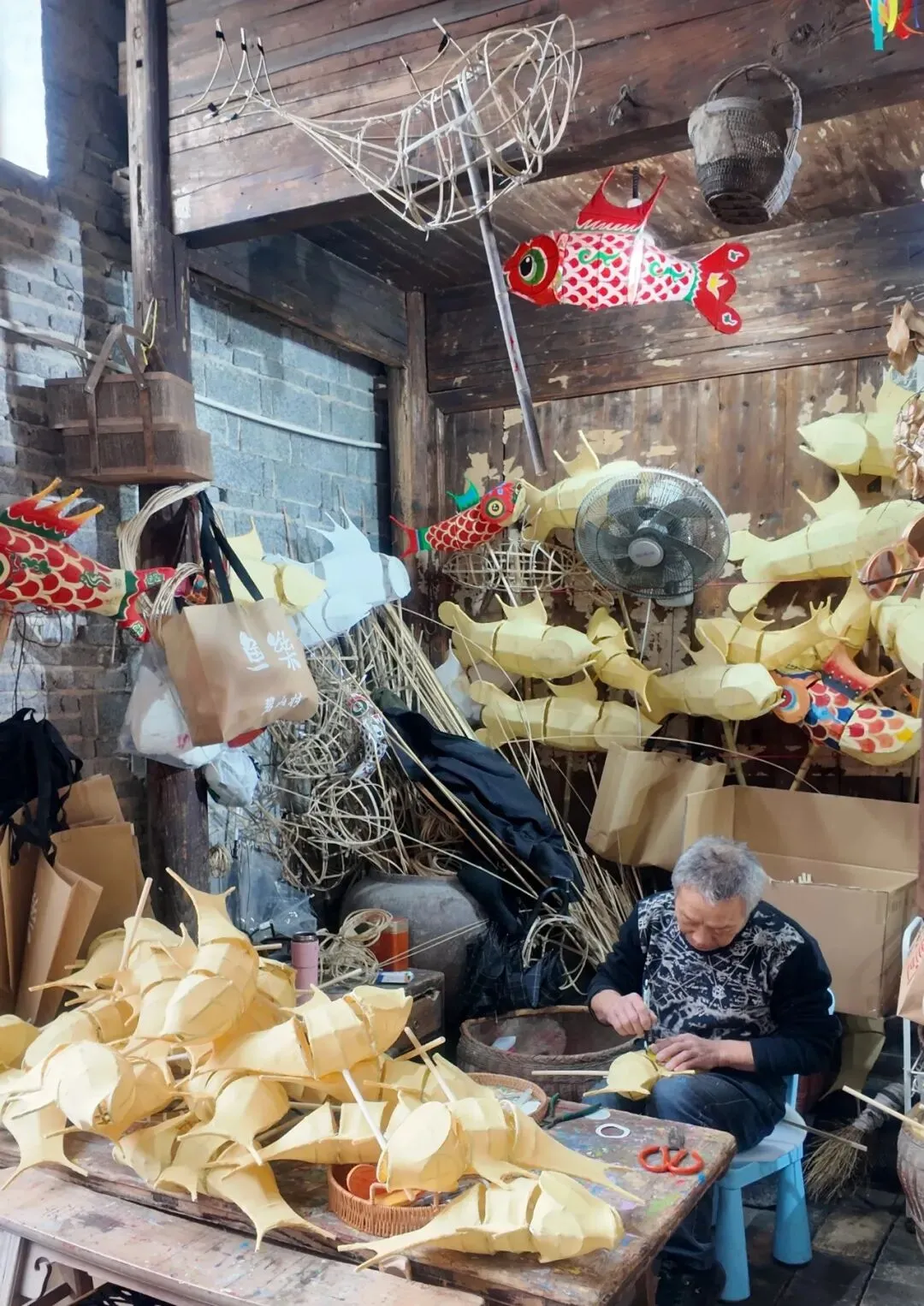 这家鱼灯店是瞻淇村的鱼灯传承人开的。这里有做手工鱼灯的体验活动。做鱼灯的时候,店里的老传承人会还在旁边指导制作。