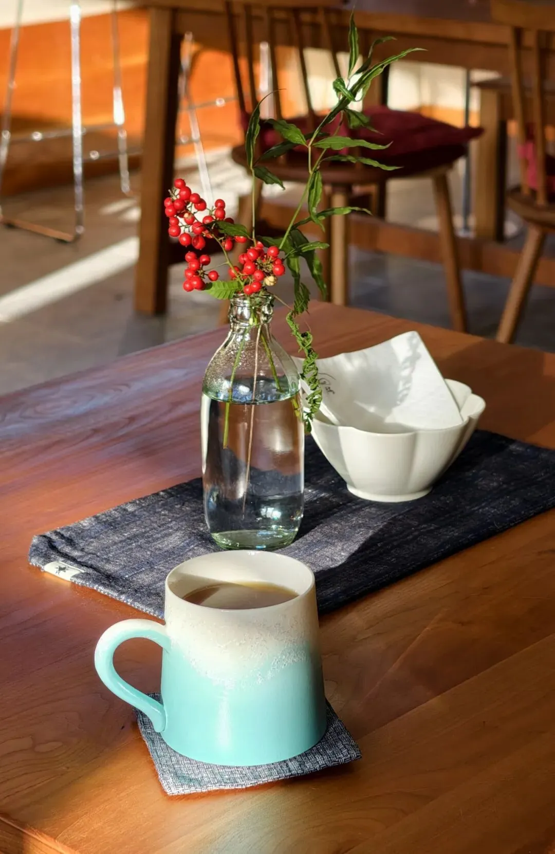 店里的风格是一种安静温柔的田园风:木制桌椅、壁炉、每个样式都不同的布艺小杯垫和陶瓷马克杯、带着禅意的野口勇纸灯,以及时长换新的本地山野花束。