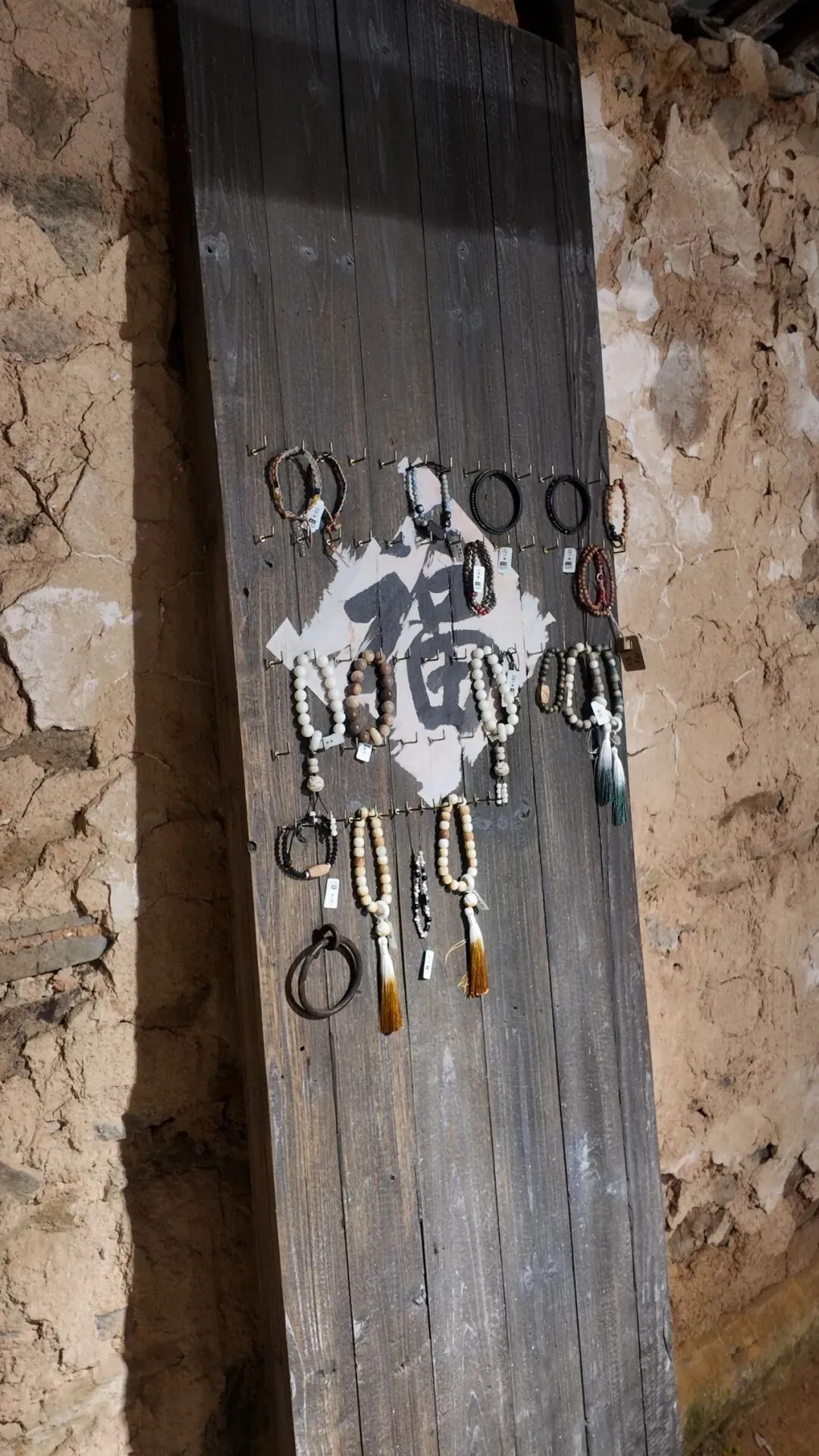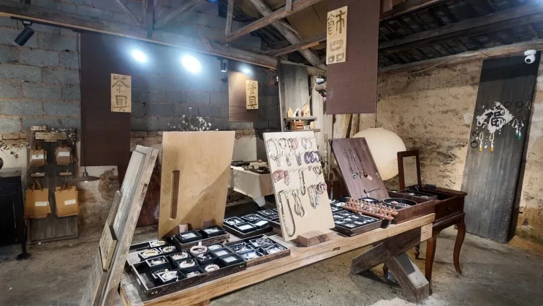 空间保留了老房子原本的样子:木质房梁、土墙都还在,连旧房门也被拿来当作首饰的展示架。