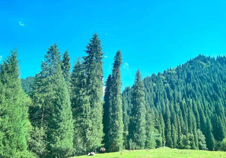 这片拥有四千万年历史的云杉林被誉为"天山上的活化石",是中国最大的原始云杉林之一。雪山与云杉相映,景色壮丽。