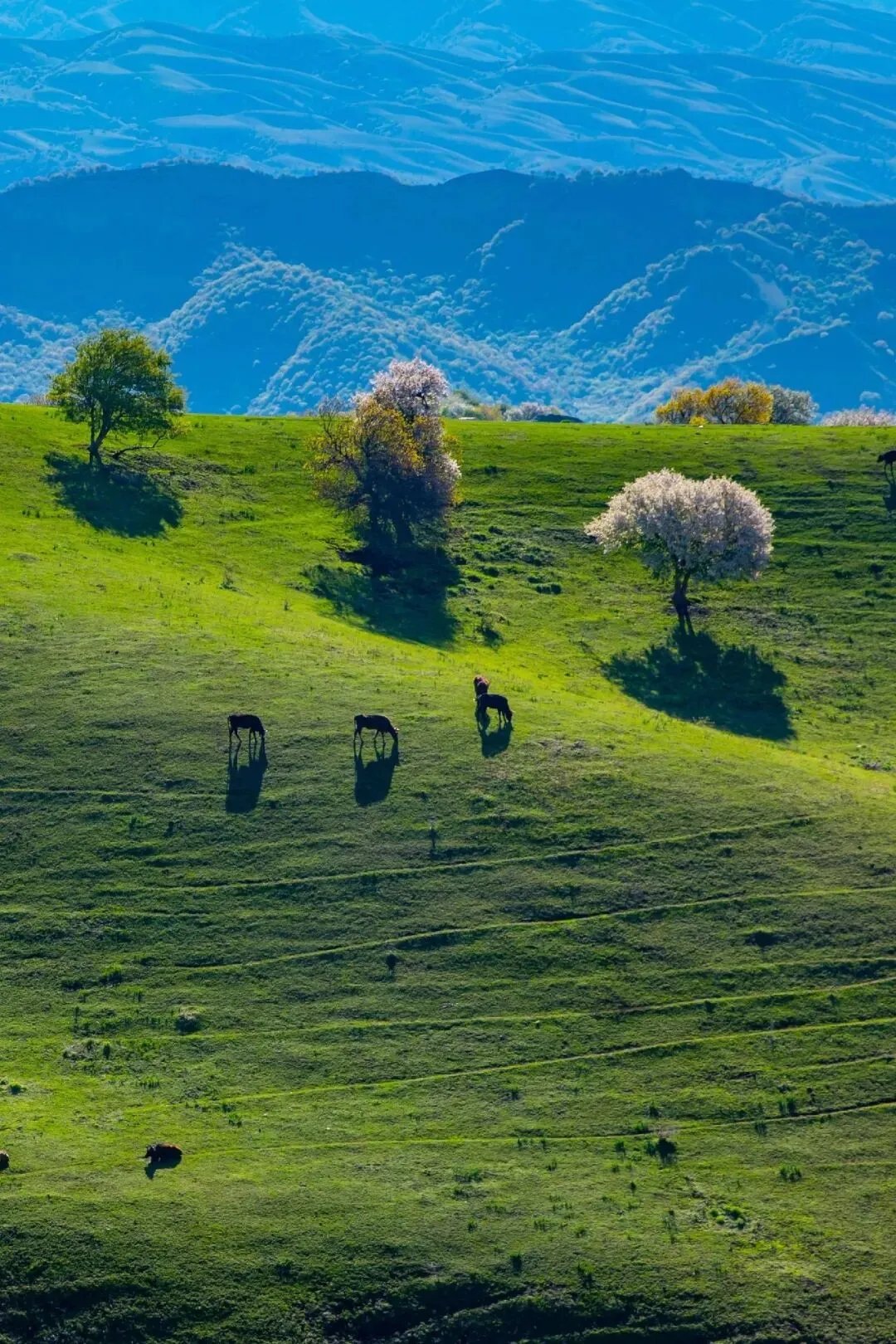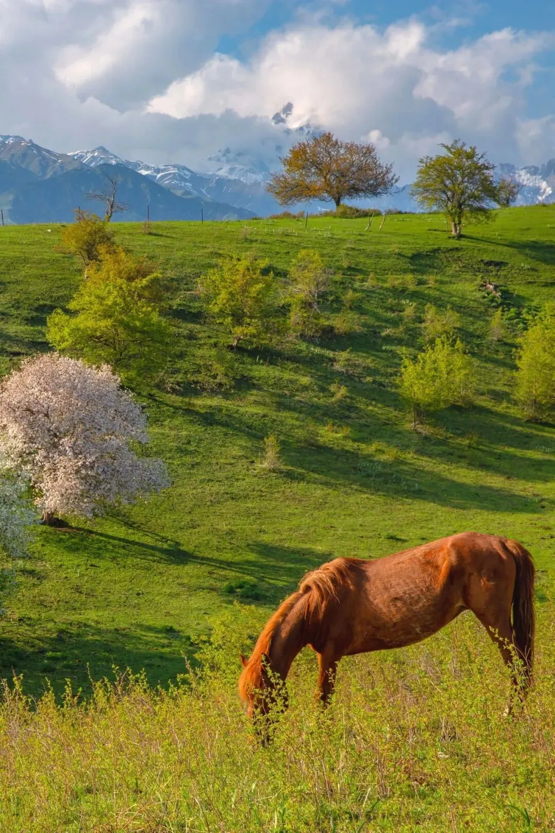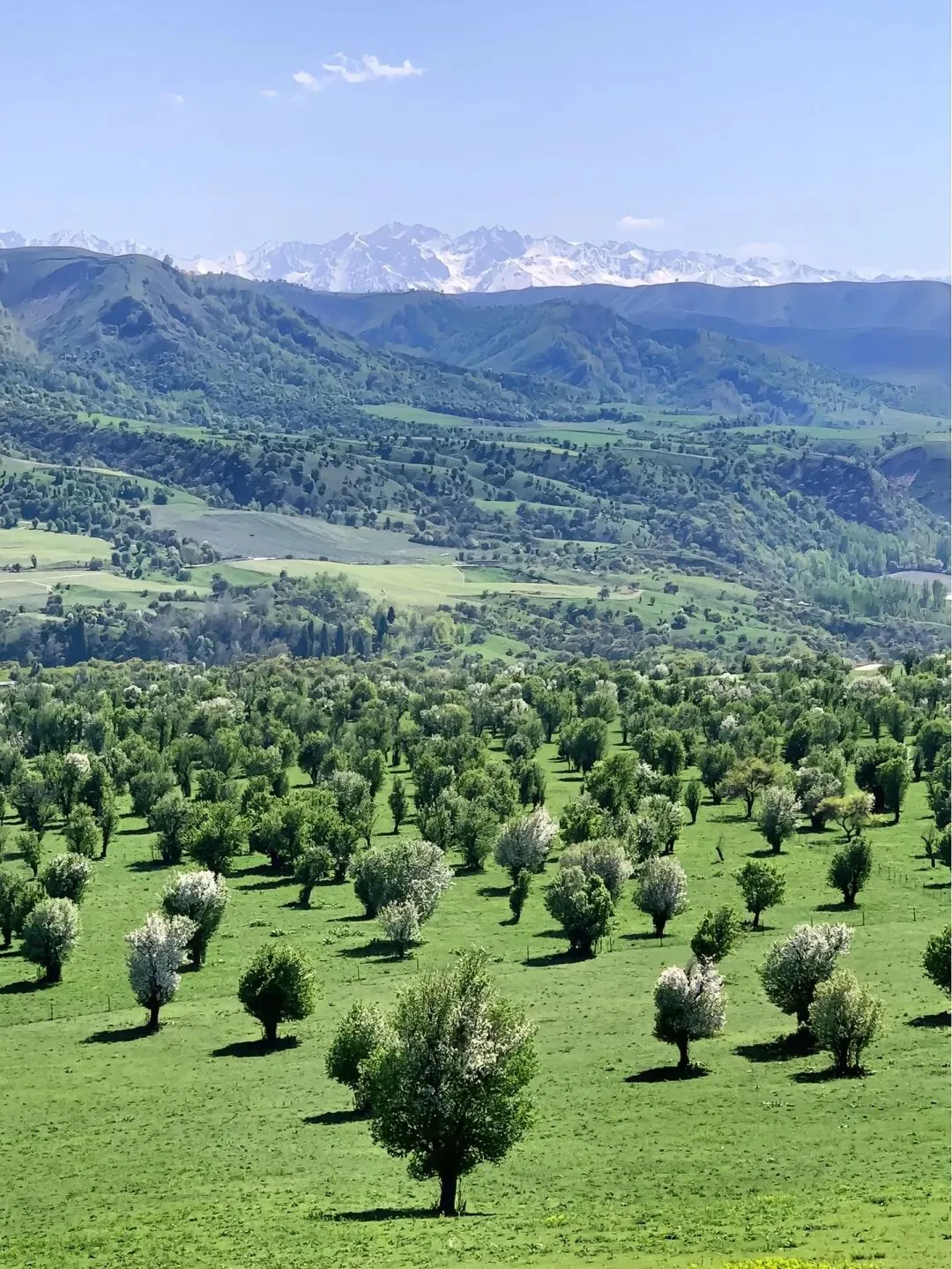 萨哈野果林,位于新疆伊犁哈萨克自治州新源县喀拉布拉镇克孜勒塔勒村,是一片深藏在阿吾勒山中的原始野果林。每年4月底,当万亩野果林繁花似锦、香气远飘,你站在沃尔托托山上,看粉白花海与皑皑雪山同框,听松涛阵阵与野鸟鸣唱交织,便会明白——这不仅是春天最原始的美好,更是大自然留给人类的一座活态基因宝库