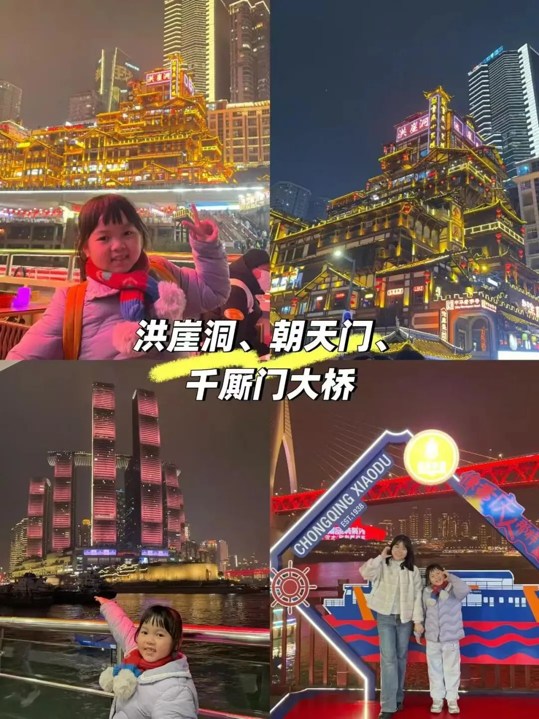 傍晚到重庆北,打车到酒店放行李后,直奔洪崖洞,洪崖洞人超级多,我们带娃坐船夜游两江,在船上看洪崖洞、朝天门、千厮门大桥的夜景非常美[萌萌哒R]