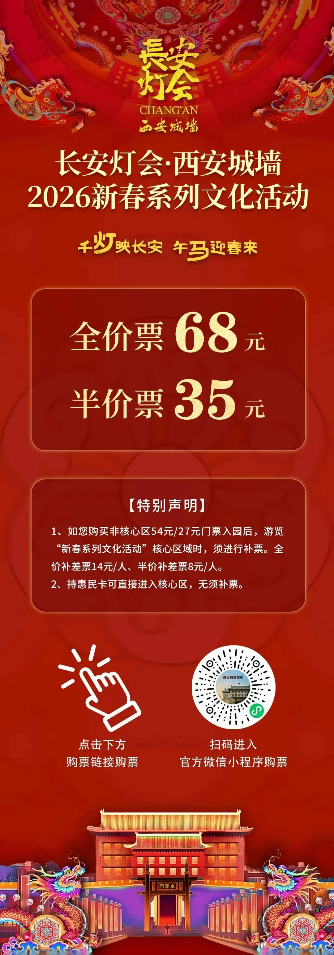 不同于冬日,春日的城墙灯会多了几分柔和与诗意。一盏盏花灯藏着长安的故事,映着游人的笑意,更有惠民票价加持,不用花费太多,就能踏上千年城垣,在灯火与春风中与历史温柔相拥,感受古城夜晚的别样浪漫。