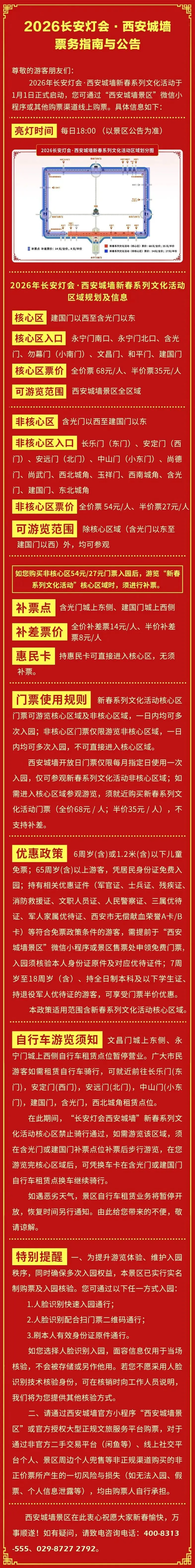 “长安灯会”新春系列文化活动核心区禁止骑行通过,如需游览该区域,须在含光门或建国门补票点位补票后步行游览,在您游览完核心区域后,可凭换车卡在含光门或建国门自行车租赁点换车继续骑行。