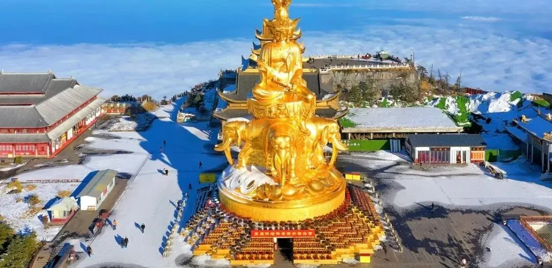 中午:抵达雷洞坪,步行1.5km至接引殿(路上或遇猴哥,⚠收起食物塑料袋!)在接引殿乘坐金顶索道上山。步行20分钟到达金顶,参拜十方普贤、华藏寺,欣赏云海、佛光