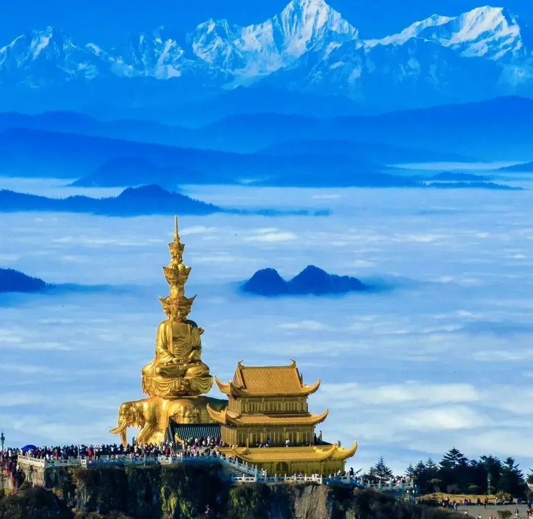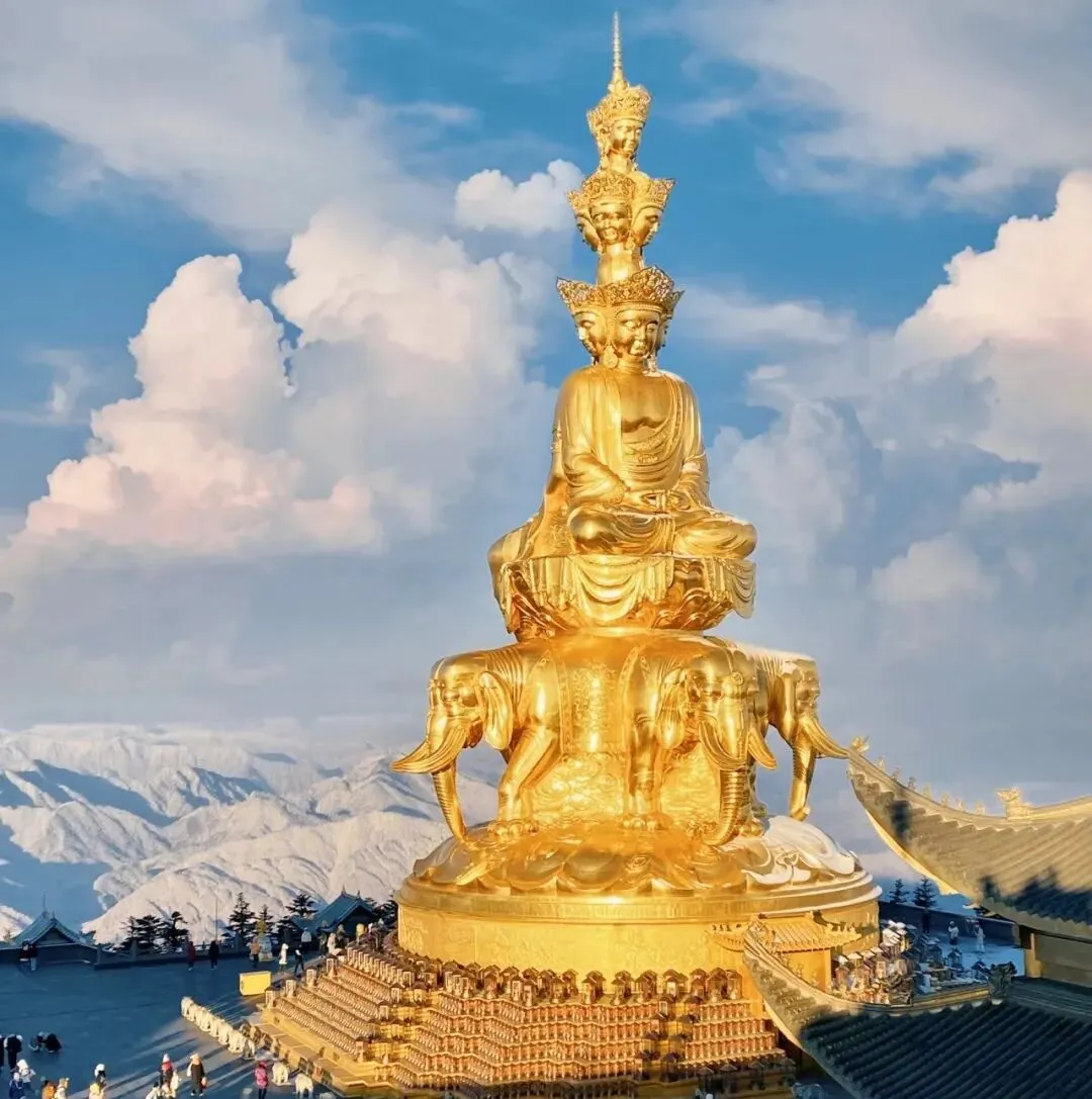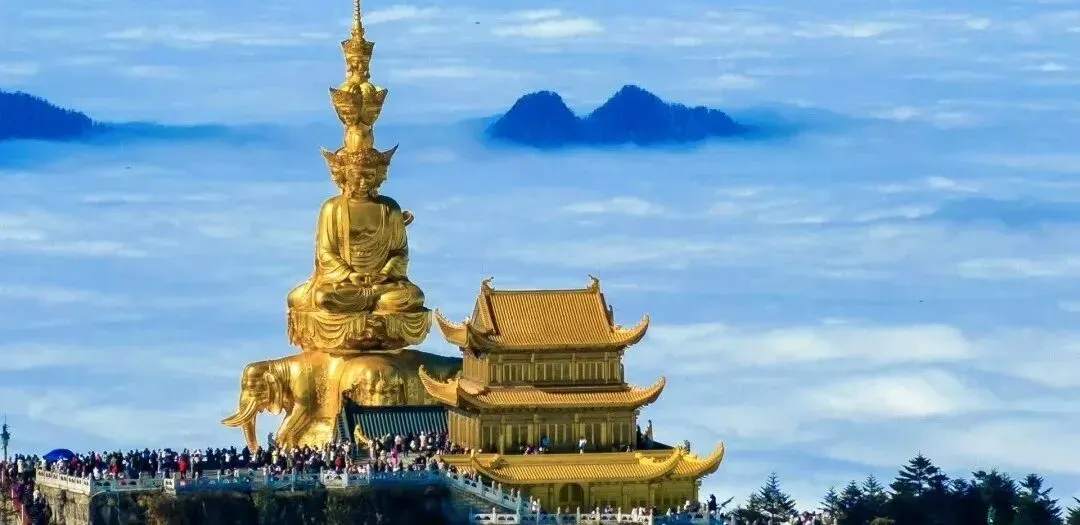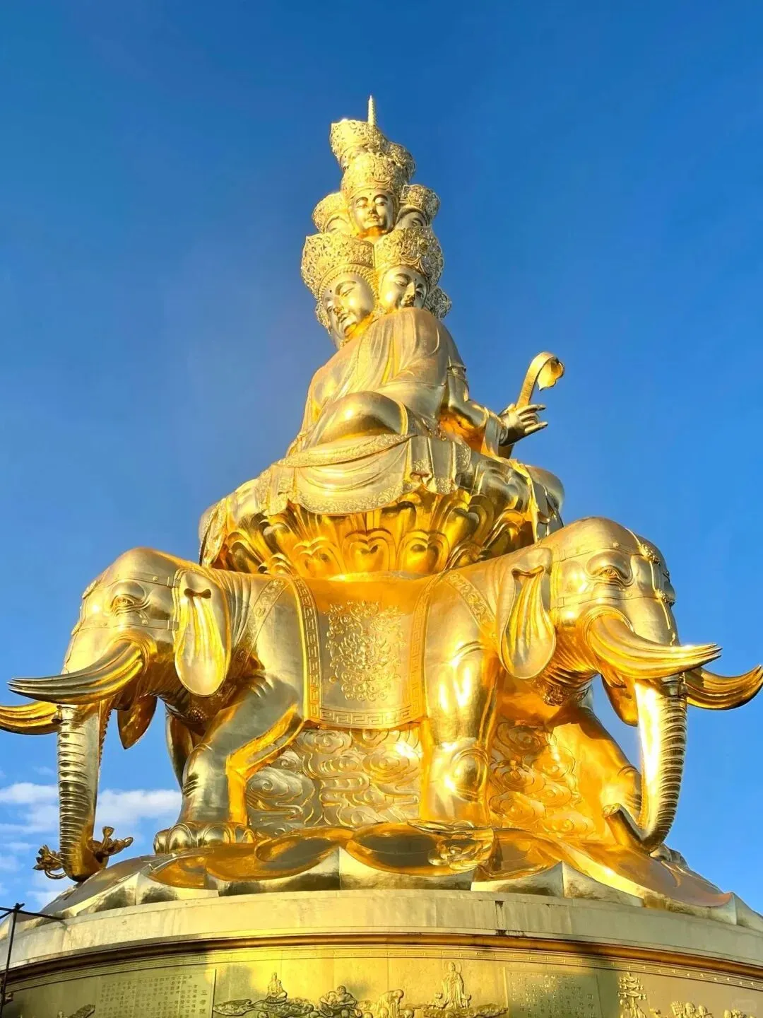 📍金顶:有壮观的金、银、铜三殿和48米高的十方普贤像,可观赏日出、云海、佛光等自然奇观。