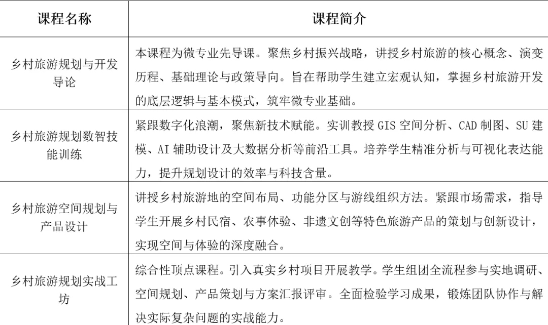 “乡村旅游规划与开发”微专业紧扣乡村振兴战略与文旅产业发展趋势,聚焦乡村旅游规划、开发、运营及管理全流程,通过系统化课程设置与案例研究、实地考察、项目实训等多元化教学方式,培养学生掌握乡村旅游发展的核心理论与实操方法,成为懂乡村、识旅游、会规划、能管理的乡村旅游专业人才。