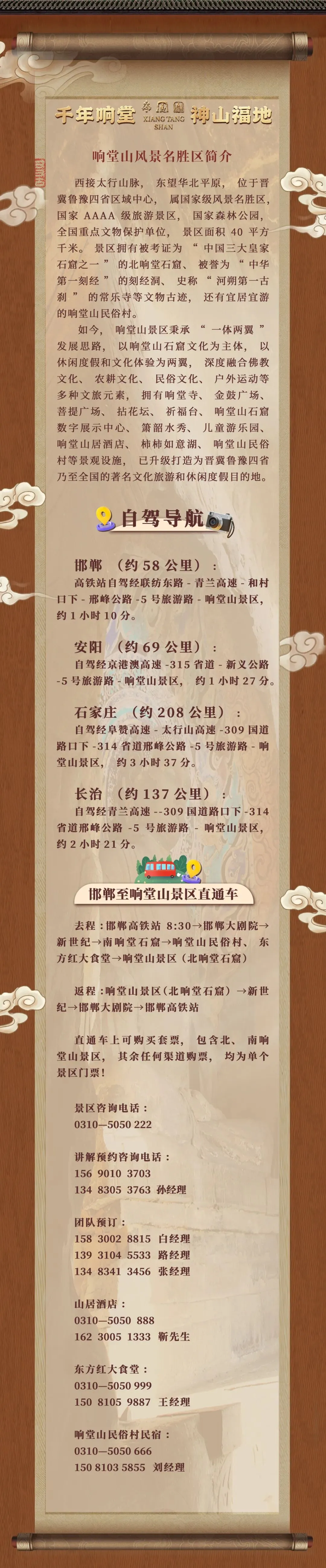 ✅ 去程(邯郸高铁站→响堂山景区):邯郸高铁站 8:30→ 邯郸大剧院 → 新世纪中心 → 响堂山景区(北响堂石窟)