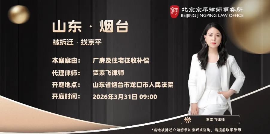 3月31日 本案案由:厂房及住宅征收补偿 代理律师:贾素飞律师(15110272283) 开庭地点:山东省烟台市龙口市人民法院