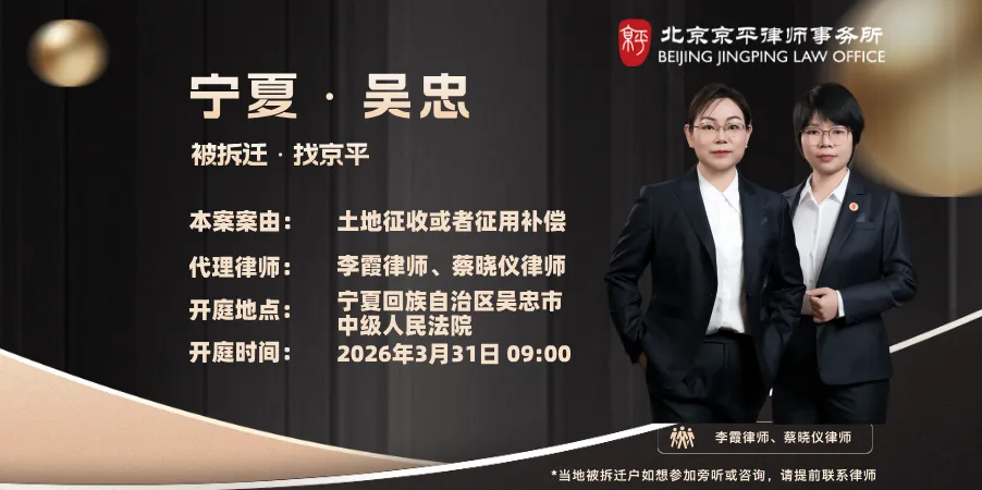 本案案由:土地征收或者征用补偿案件类型:企业拆迁 代理律师:李霞律师(13520136072)、蔡晓仪律师(18701566002) 开庭地点:宁夏回族自治区吴忠市中级人民法院 开庭时间:2026年3月31日09:00